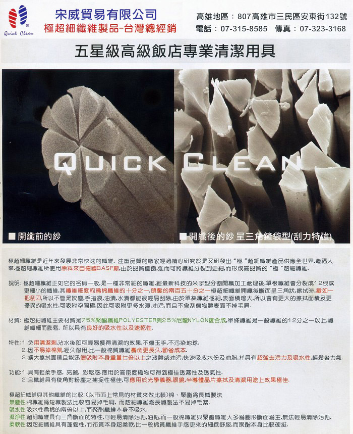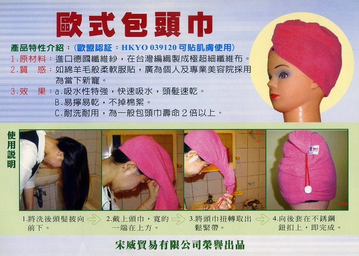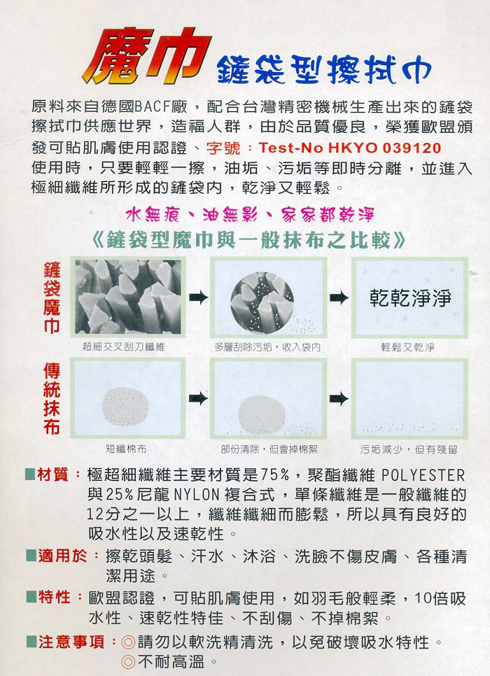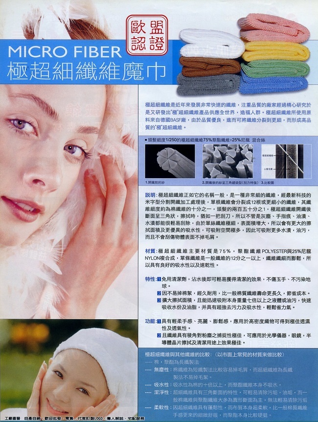 快樂–潔淨–輕鬆 生活用品系列— 高品質·高耐用 環保新產品為保護地球盡份力 歐盟認證 ☆QUICK CLEAN☆ MICRO-FIBER TECHNOLOGY MAGIC CLOTH 極超細纖維魔布 水無痕、油無影、家家都乾淨 (Package–hair towel) (包頭巾) 去污力特強·吸水力特強·不掉棉絮·清洗容易·經久耐用· Absorbent exceptionally strong, exceptionally strong detergency, lint-free, easy to clean, durable 【鵝黃色】–強力吸水歐式包頭巾